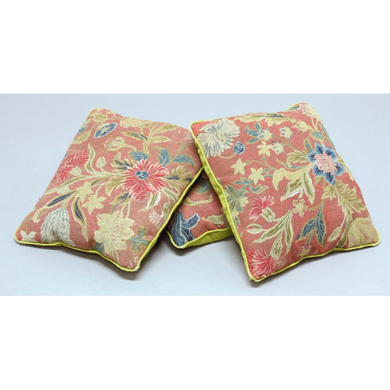THREE FLORAL TAPESTRY CUSHIONS, the fabric 19th century with flowers and foliage on a deep pink ground, each panel approximately 35 x 35cm (3)