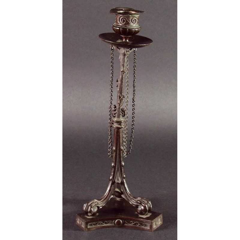 BRONZE 'GRAND TOUR' CANDLESTICK, the column cast with twisting foliage and bees on a tripod base with lion claw on ball feet, 26.5cm