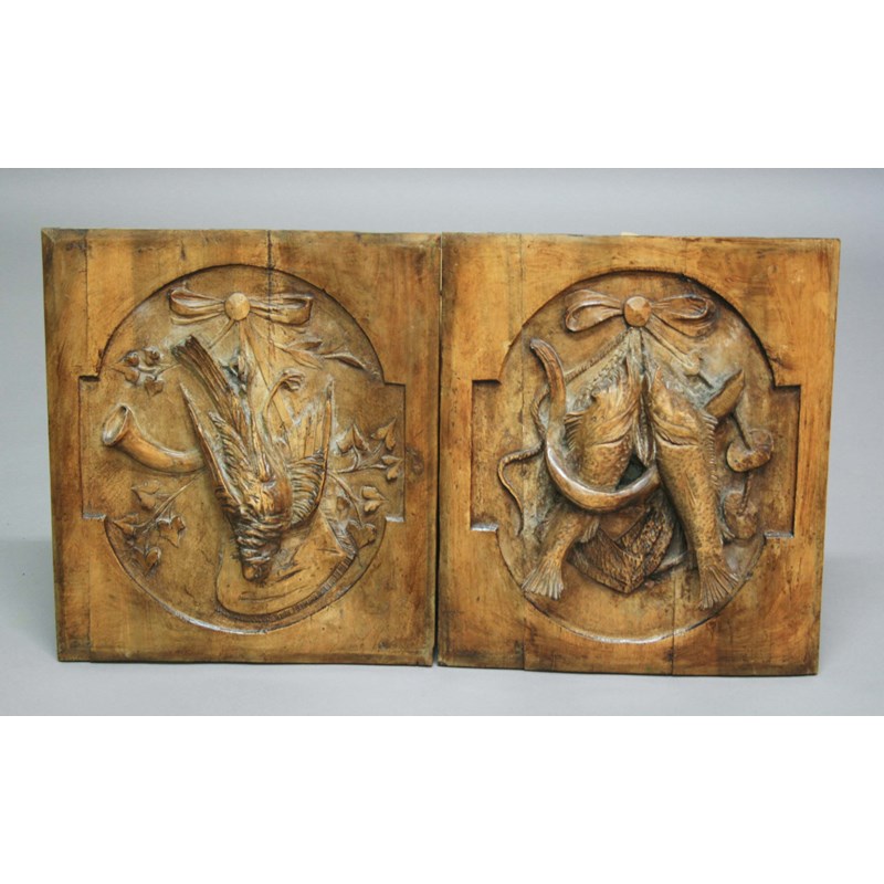 PAIR OF WALNUT PANELS, 19th century, carved with hanging game and fish, 52 x 46cm (2)
