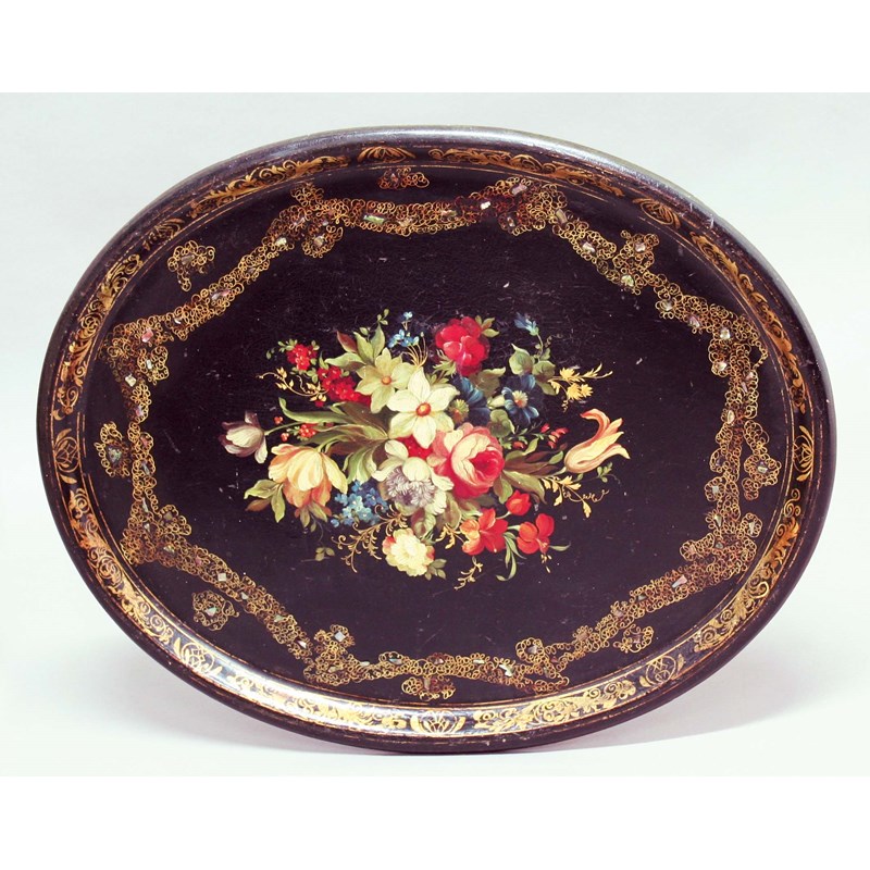 VICTORIAN OVAL PAPIER MACHE TRAY, a central painted floral spray inside gilt swags with abalone shell inlay, 76cm x 60cm