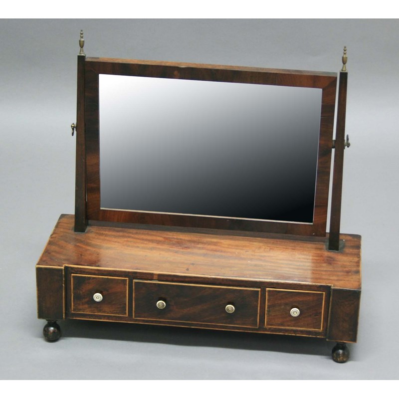 the rectangular plate on tapering square section supports on a reverse breakfront base, the three drawers with turned ivory pulls, raised on ball feet, height 56cm, width 59cm, depth 23cm