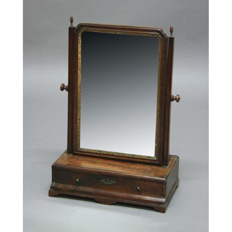 GEORGE II MAGOHANY TOILET MIRROR, the near rectangular plate on abase with a single, shaped drawer, height 65cm