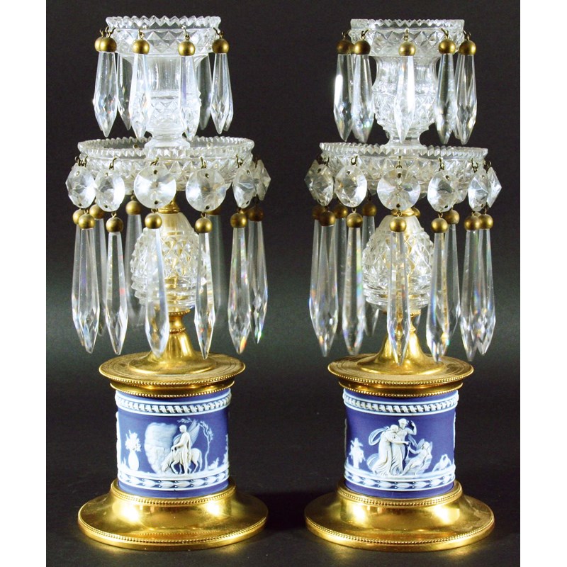 PAIR OF WEDGWOOD AND CUT GLASS CANDLESTICKS, with glass sconces, drip trays and drops above brass and Wedgwood blue jasper cylindrical bases, 30cm (2)