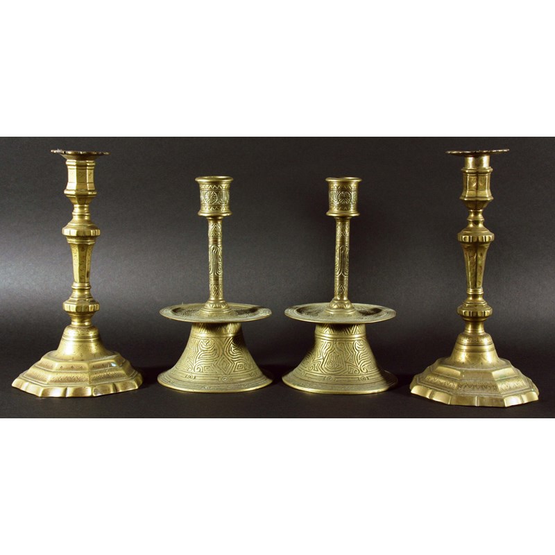 with stylised scrolling decoration, height 22cm; together with another pair of Dutch brass candlesticks (4).