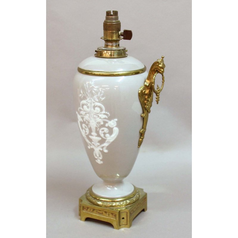 FRENCH PORCELAIN TABLE LAMP, of ovoid form, with pate sur pate style decoration of a classical maiden on a grey ground, with gilt brass lion mask handles, mounts and foot, height excluding light fittings 48cm