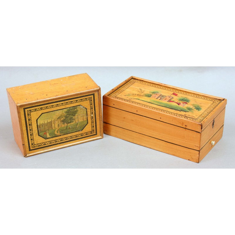 circa 1840, the first decorated with a view titled 'ROYAL MEWS, BRIGHTON' published by G Wise, Tunbridge' the second with a locking drawer and
