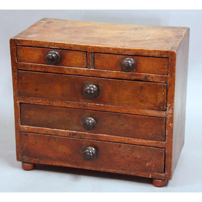 ELM MINIATURE CHEST OF DRAWERS, probably late 18th century, two short over three long drawers with turned pulls, height 26.5cm, width 30cm, depth 17cm