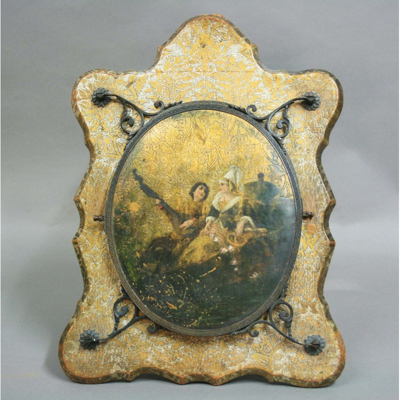 the oval front, painted with a medieval style couple, folding out revealing three oval mirrors, on a easel back, 48cm