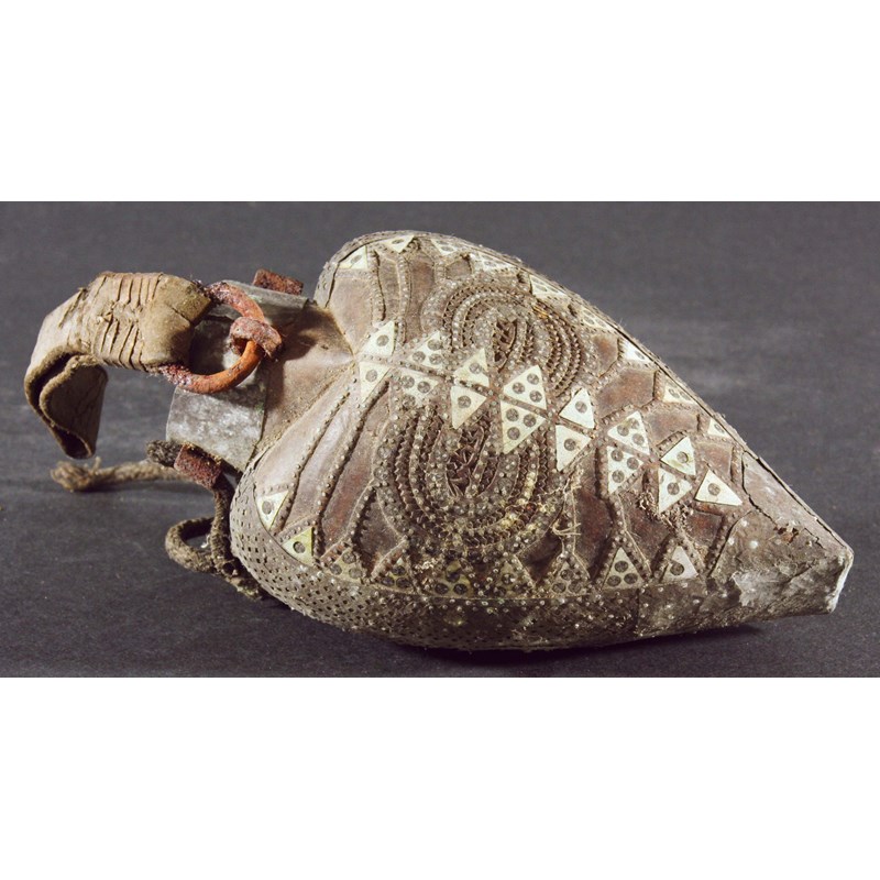 TRIBAL ART: NORTH AFRICAN WATER FLASK, the wooden or gourd body encased in copper with pierced geometric decoration, with leather strap, 16.5cm