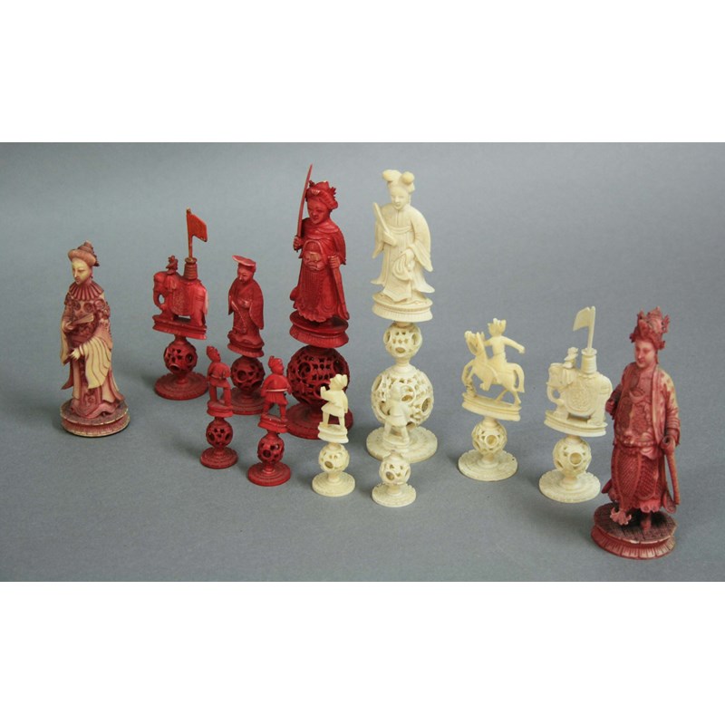 late 19th century, each piece mounted on a puzzle ball base, height of kings 14cm; together with another East and West part set and a Staunton style part set (70)