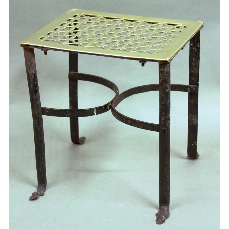 BRASS AND STEEL FOOTMAN, the pierced top above an X stretcher and foliate feet, height 25cm, width 24cm, depth 20cm