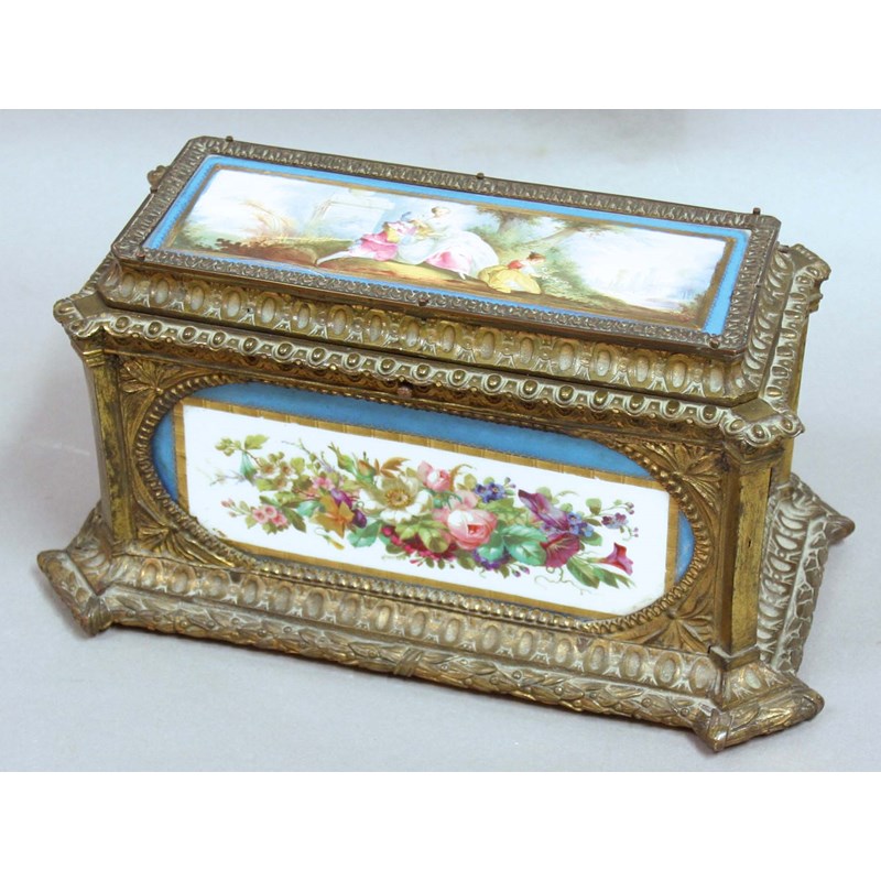 mid 19th century, mounted with Sevres style painted plaques of a romantic scene to the top and floral sprays to the sides, height 16cm, width 33cm, depth 19cm