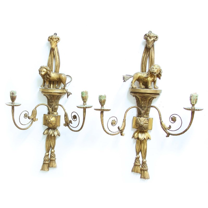 late 18th or early 19th century, a rams head above lions passants, a pair of scrolling branches with foliate sconces and knotted ribbon terminals, 79cm (2)