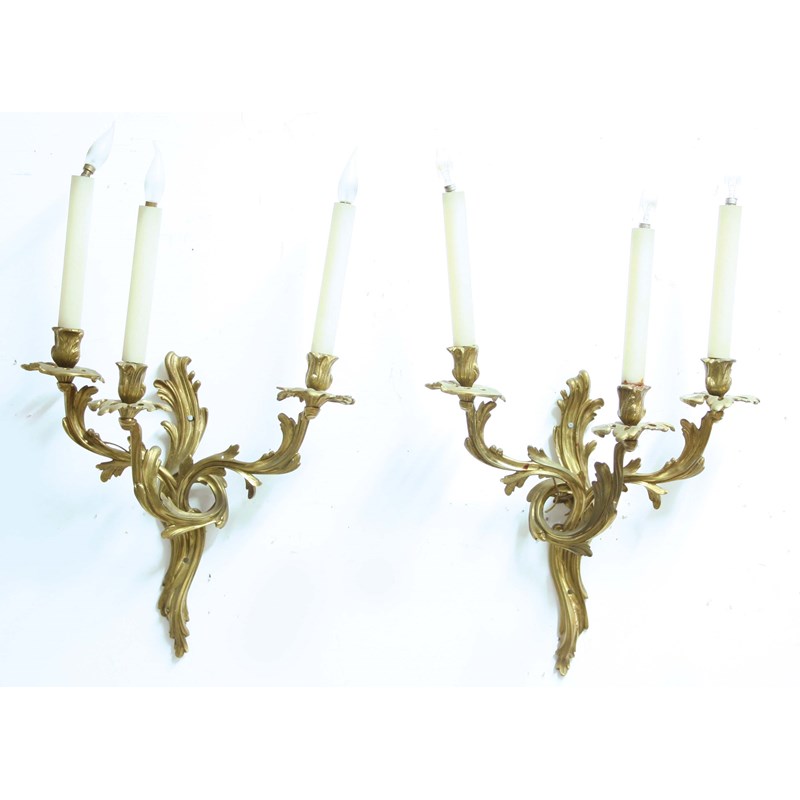 PAIR OF THREE BRANCH ORMOLU WALL APPLIQUES, the three scrolling branches with pierced sconces, height excluding candle mounts 38cm (2)