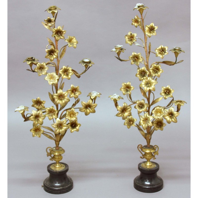 PAIR OF GILT METAL CANDELABRA, modelled as flowering lily plants growing from a two handled urn, on ebonised socle bases, 86cm (2)