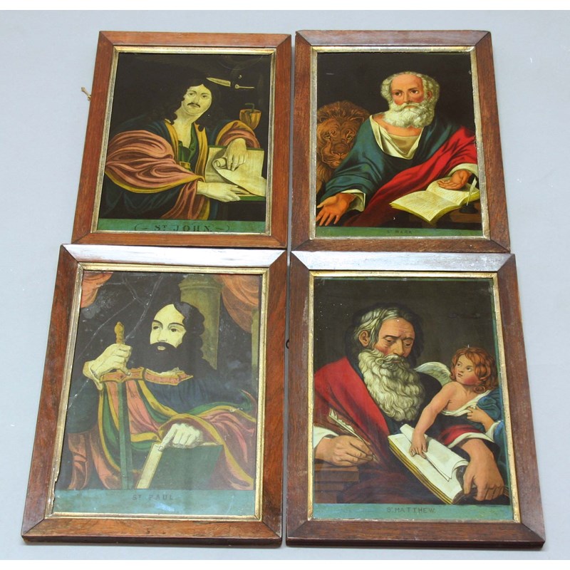 SET OF FOUR PRINTS ON GLASS, Saints Matthew, Mark, John and Paul, with hand colouring, 35 x 25cm (4)