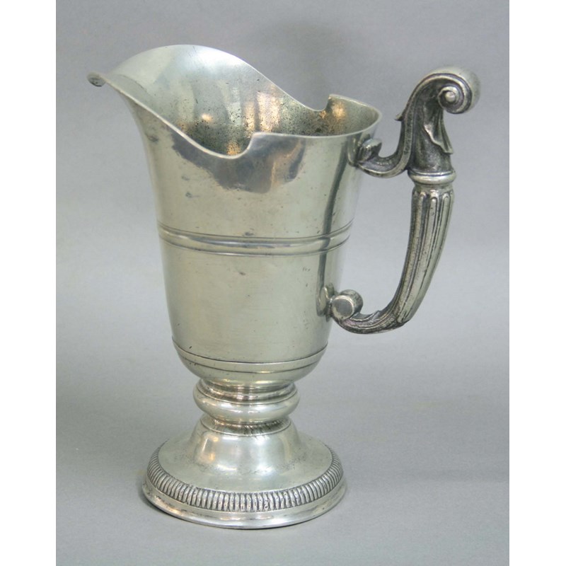 GEORGE III PEWTER EWER, early 19th century, of helmet form with scrolling handle and domed foot, height 26cm