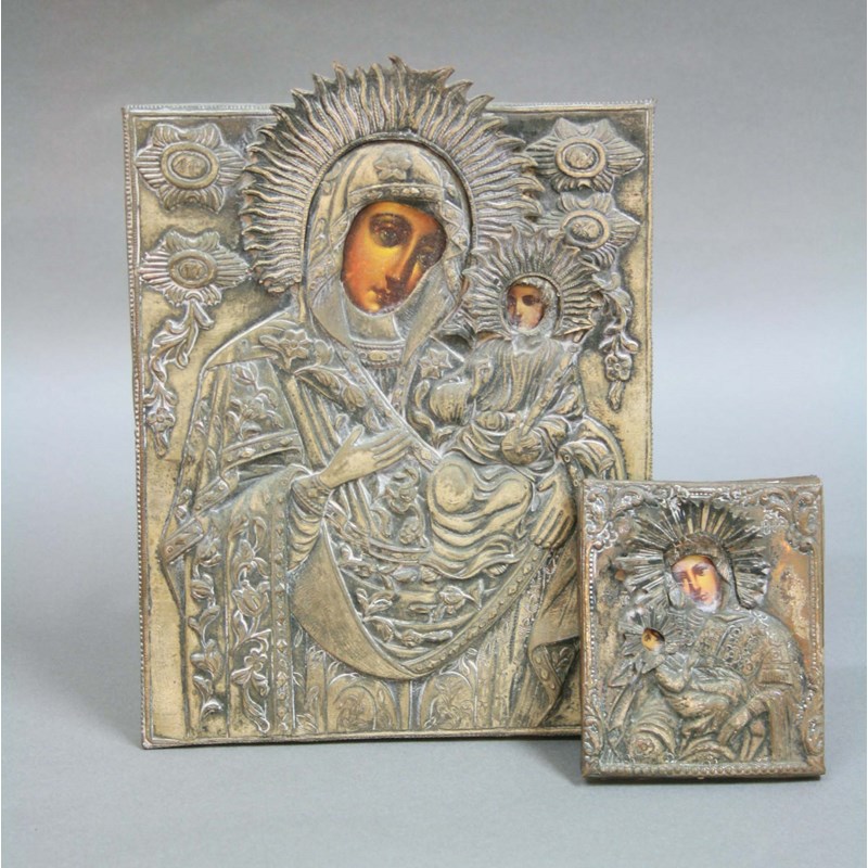 TWO ICONS, Madonna and Child, oil on board beneath metal mounts, 26.5 x 19.5cm and smaller (2)