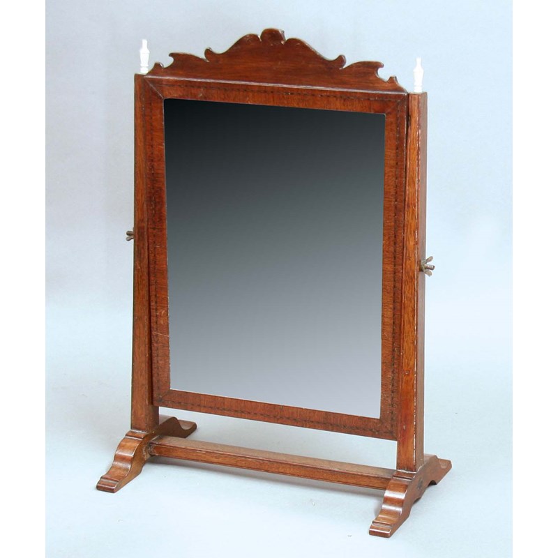 GEORGE II MAHOGANY TOILET MIRROR, the rectangular plate with shaped pediment and turned ivory finials on a trestle type frame, height 39cm, width 27cm