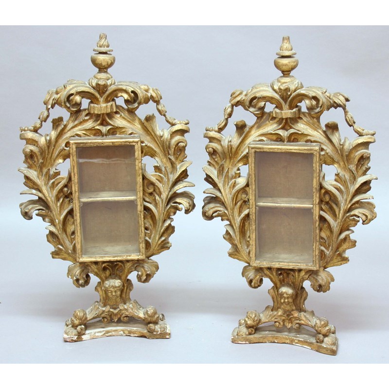PAIR OF GILT GESSO RELIQUARY FRAMES, 18th century, the rectangular glazed cabinets in scrolling foliate frames with flaming urn finials and child's mask feet, height 80cm, width 44cm (2)