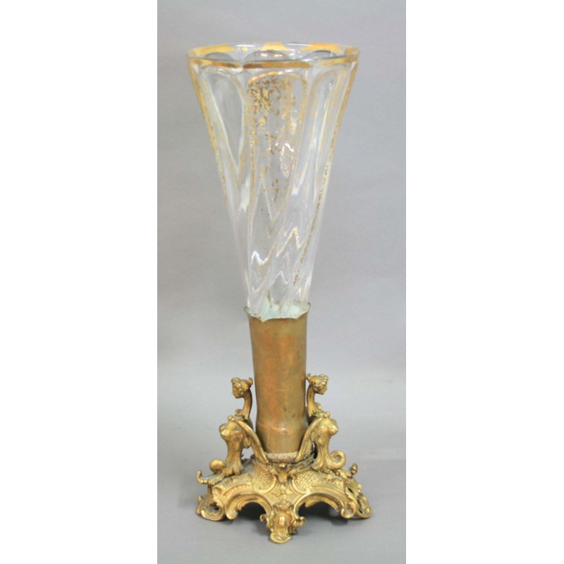 the wrythen moulded glass trumpet vase with gilt scrolling decoration on a base with a pair of winged mermaids and scrolling foot, height 52cm