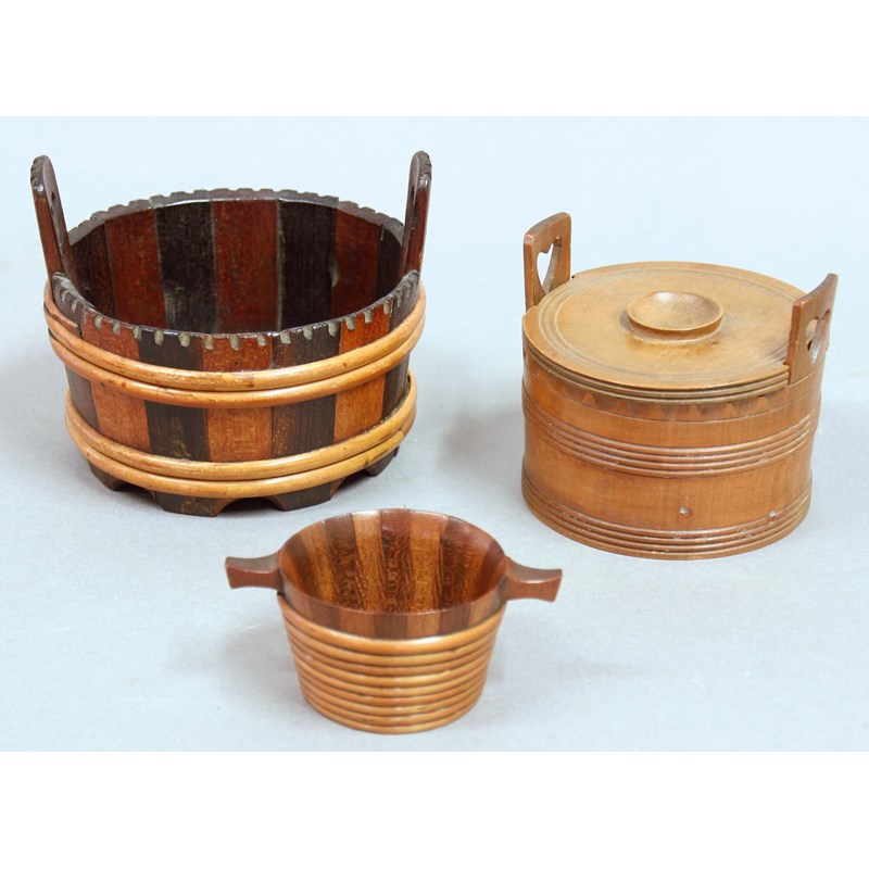 of stave construction bound with willow, one with heart shaped pierced handles; together with another box and cover, possibly Scandinavian, again with heart shaped pierced handles, 12.5cm daimeter and smaller (3)
