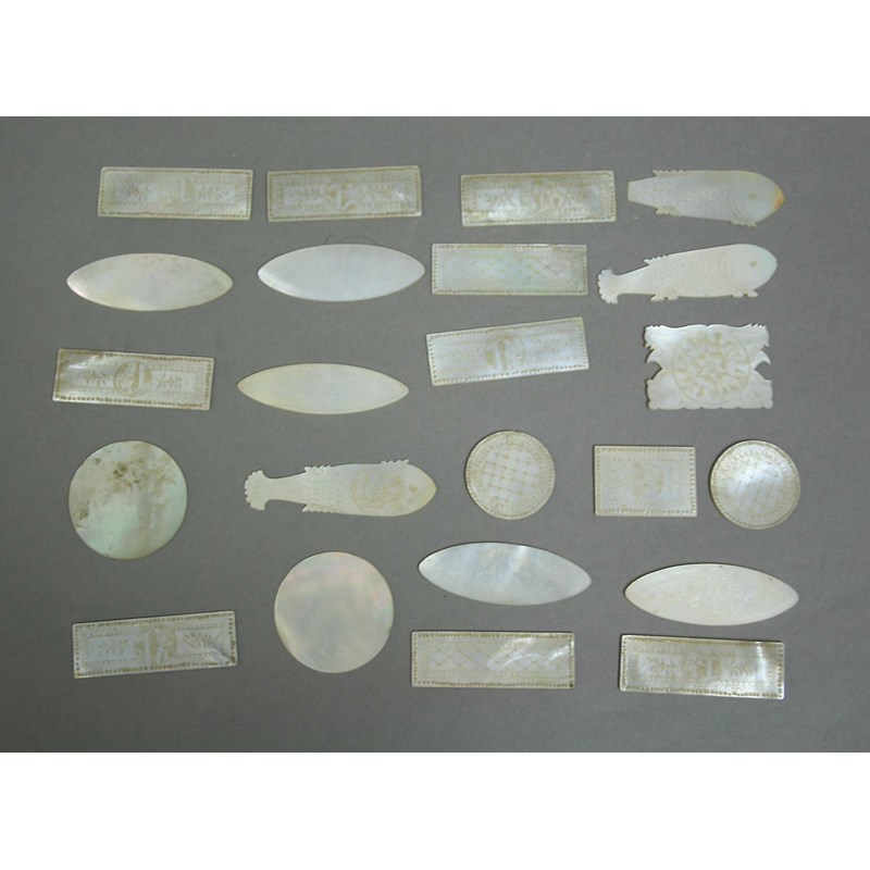 COLLECTION OF CHINESE MOTHER OF PEARL GAMING COUNTERS, various shapes and sizes with engraved decoration (parcel)