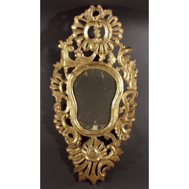 PAIR OF GILT GESSO WALL MIRRORS, circa 1800, the shaped oval plates inside scrolling and pierced frames, height 69cm (2)