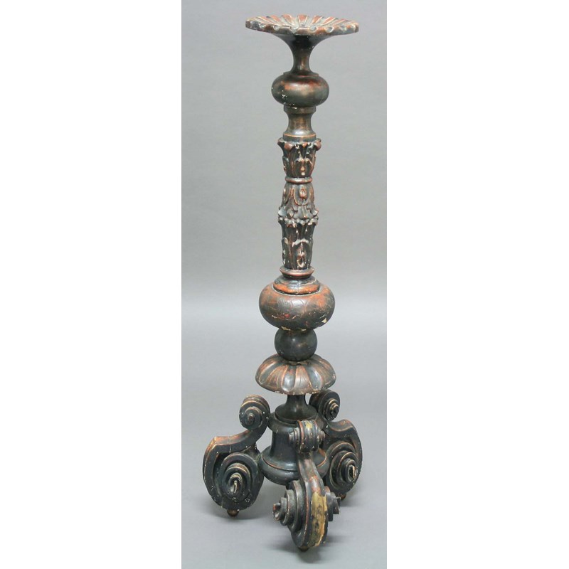 ITALIAN PAINTED TORCHERE, 19th century, sunburst carved dish on a knopped and carved column and scrolling tripod base, height 114cm