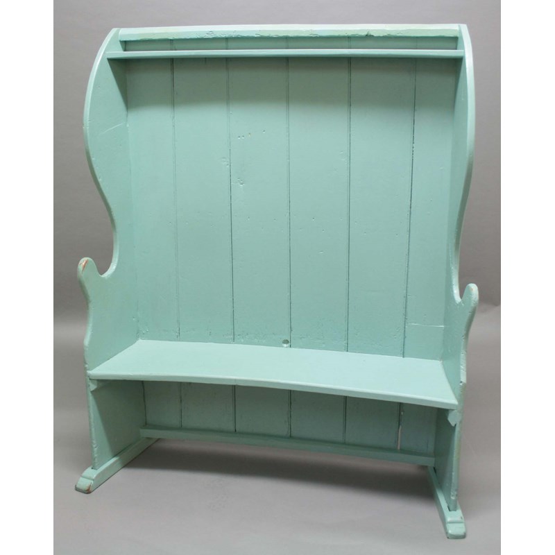PINE SETTLE, 19th century, possibly Dorset or Hampshire, a gently curved back with upper shelf and high scrolling arms, height 160cm, width 130cm