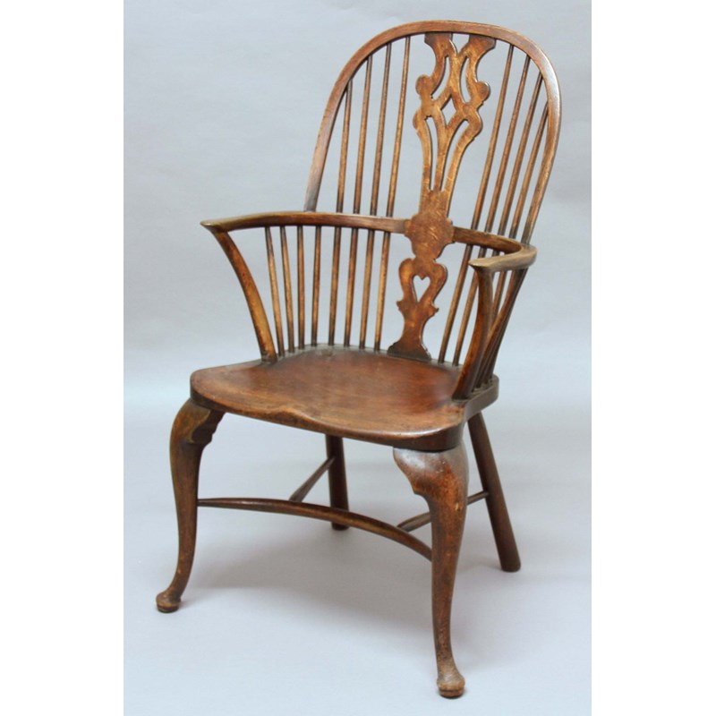 HIGH BACK WINDSOR CHAIR, 19th century, oak, ash and elm, with pierced splat, sold seat, cabriole legs and crinoline stretcher, height 106cm