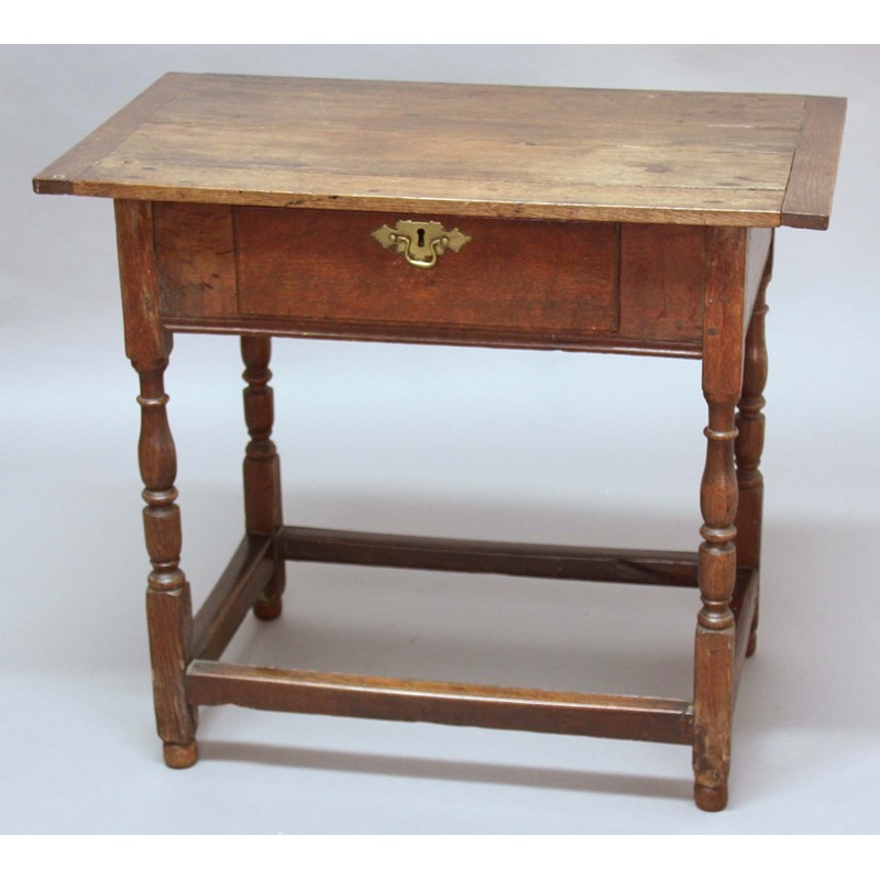 OAK SIDE TABLE, 18th century, the cleated rectangular top above a single drawer, turned legs and block stretchers, height 69cm, width 80cm, depth 47cm