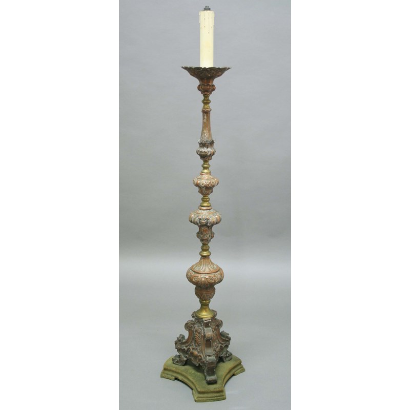 CONTINENTAL COPPER AND BRASS FLOORSTANDING CANDLESTICK, 19th century, scrolling foliate decoration, height to drip tray 124cm