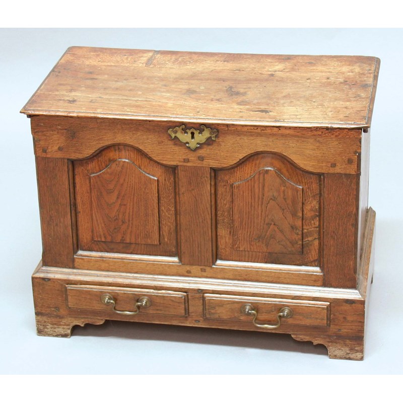 late 18th century, the hinged cover above a pair of arching, fielded panels and a pair of drawers, height 46cm, width 61cm, depth 33cm