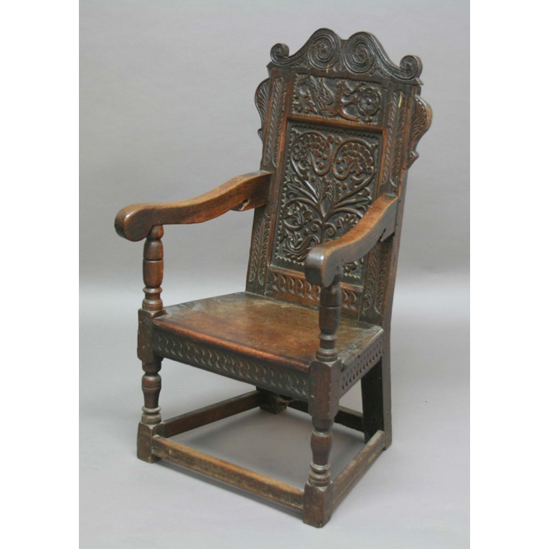 17th century and later, the scrolling top rail above a carved dragon, tree of life panel, foliate 'wings', slightly scrolling arms, solid seat and box stretcher, height 110cm