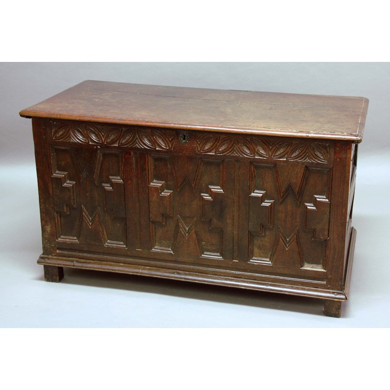 OAK COFFER, late 17th century, the hinged cover above a triple panelled front with geometric moulded decoration, height 73cm, width 130cm, depth 64cm