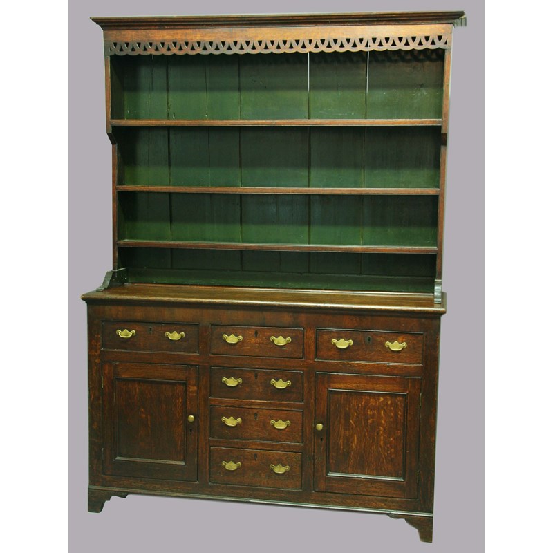 later 18th century and later, the top with pierced apron and three shelves on a base with a T arrangement of 6 drawers around a pair of panelled cupboards, height 220cm, width 163cm
