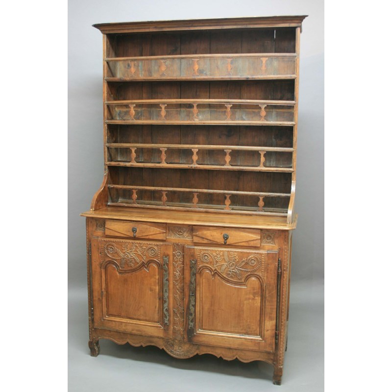 Normandy, late 18th or early 19th century, the moulded cornice above three shelves with pierced galleries, the base with a pair of drawers with lozenge shaped panels flanking foliate carving above a pair of doors with shaped panels, floral and foliate carving, wavy apron and shaped feet, height 221cm, width 136cm, depth, 53cm