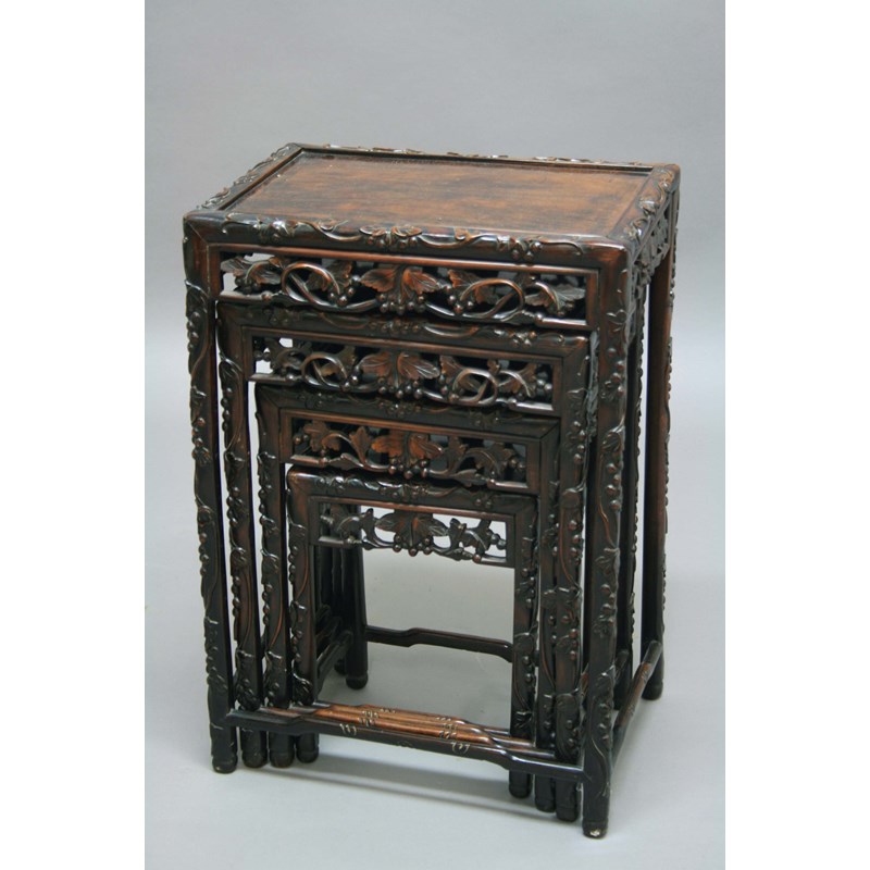 NEST OF FOUR CHINESE HARDWOOD TABLES, carved scrolling vine borders and pierced aprons, height 71cm, width 49cm (4)