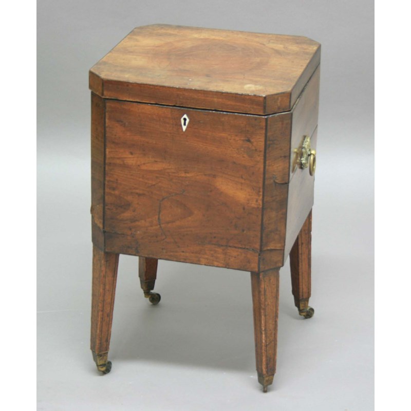 of canted square form, with replacement liner, pair of brass hoop handles, on tapering square section legs, height 59cm, top 35cm square
