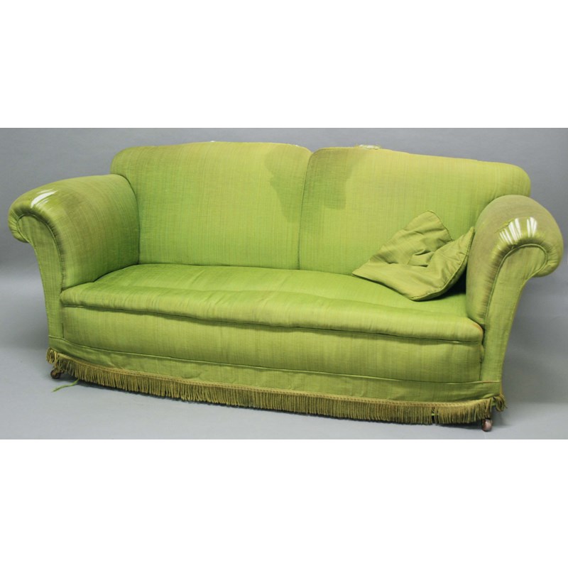 the shaped back above scroll arms, two loose cushions on a stuffed over base and turned mahogany stained front legs with brass castors, length 195cm, depth 95cm