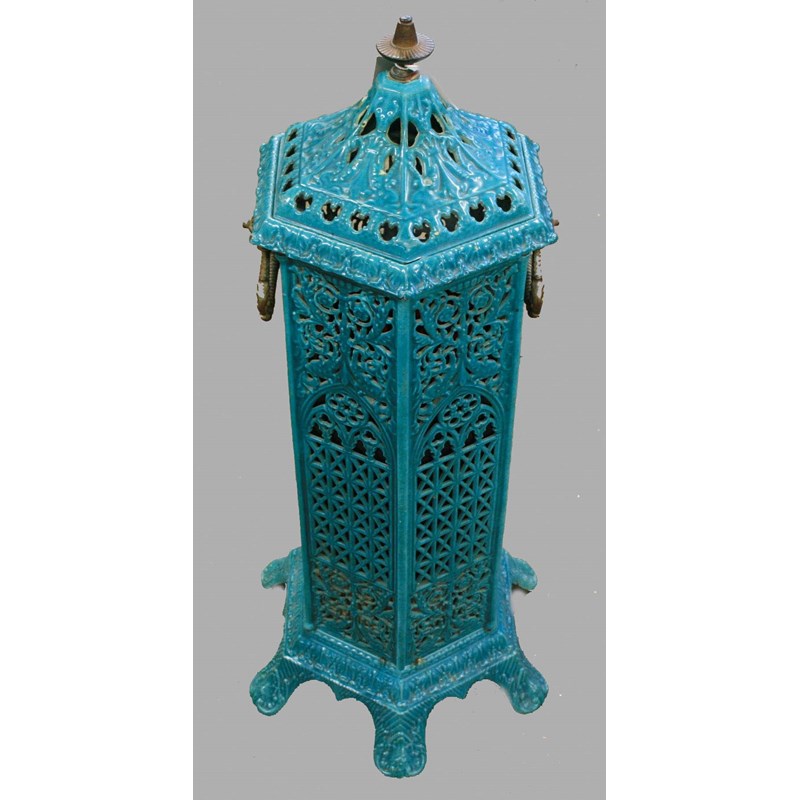 late 19th century, of hexagonal form, with arching pierced decoration with red glass panels behind, bronzed handles and finial, height 86cm