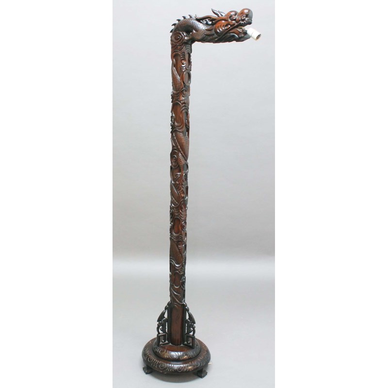 carved with a sinuous body amongst clouds on a circular base, height 178cm; together with a fretwork lamp shape frame (2)