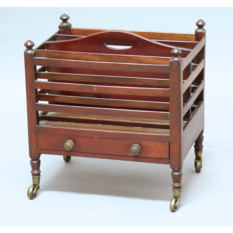 VICTORIAN MAHOGANY CANTERBURY, with four sections and a single drawer, height 47.5cm, width 46cm, depth 36cm