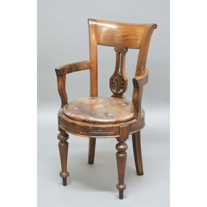 early 19th century, the bar back with vase shaped splat with foliate carving above a circular leather buttoned seat and turned front legs, height 90cm