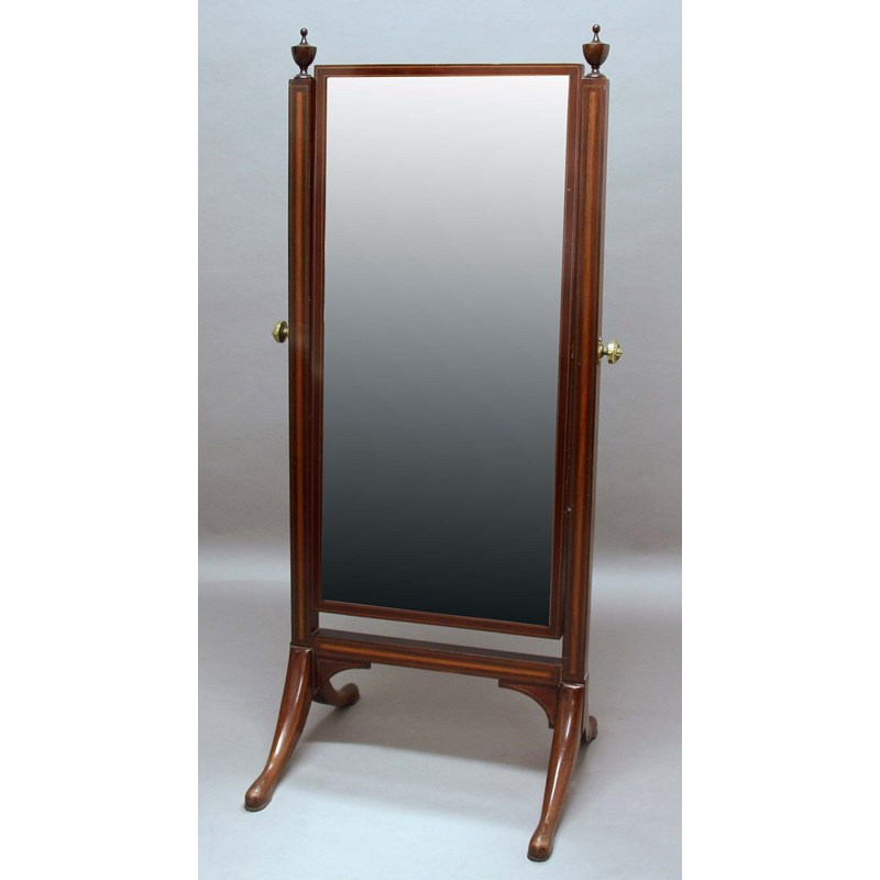 the rectangular plate on square section supports with urn finials and cast lions head handles, on sabre legs, the whole with boxwood and ebony inlay, height 166cm, width 78cm, depth 66cm