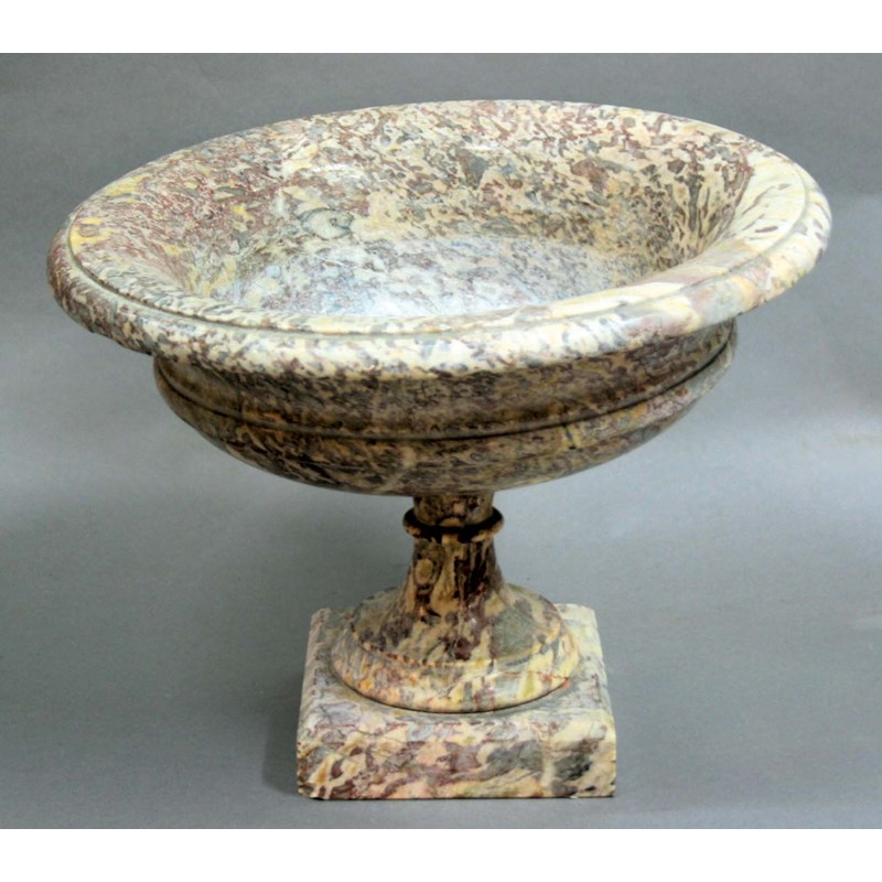 PINK VEINED MARBLE BOWL ON STAND, of flattened ovoid form on a socle base and square foot, height 28cm, diameter 36cm