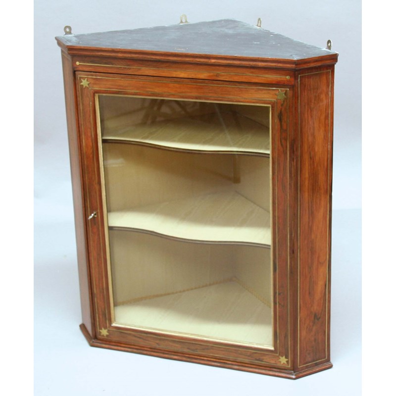 REGENCY ROSEWOOD AND BRASS INLAID CORNER CABINET, the moulded cornice above a glazed door enclosing serpentine shelving, height 92cm, width 81cm