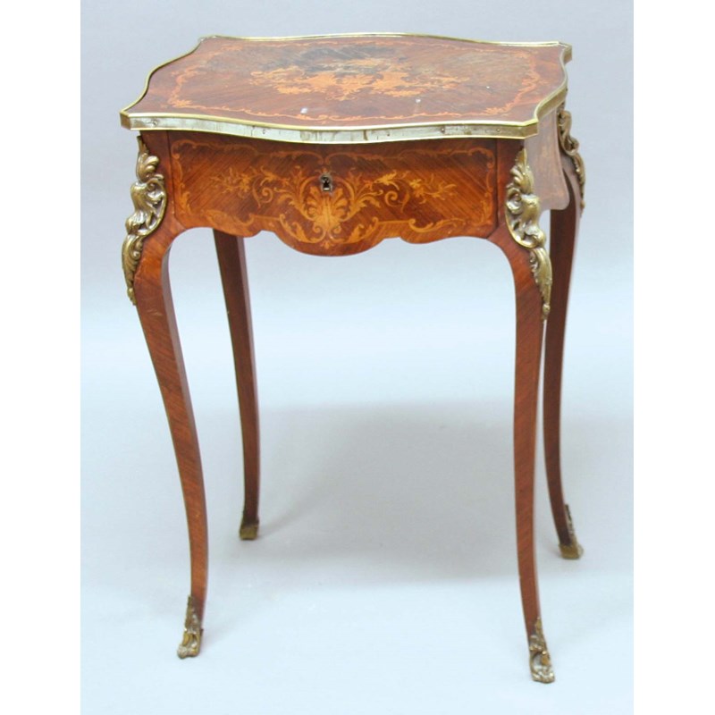 of serpentine form, the top with scrolling foliate inlay above a single drawer and cabriole legs, height 74cm, width 52cm, depth 41cm