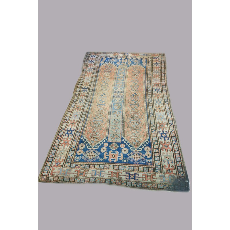Central Caucasus, circa 1880, Megir design, the indigo field with a narrow panel of geometric devices flanked by two madder lozenges enclosed by ivory borders of hooked motifs, 250cm x 140cm